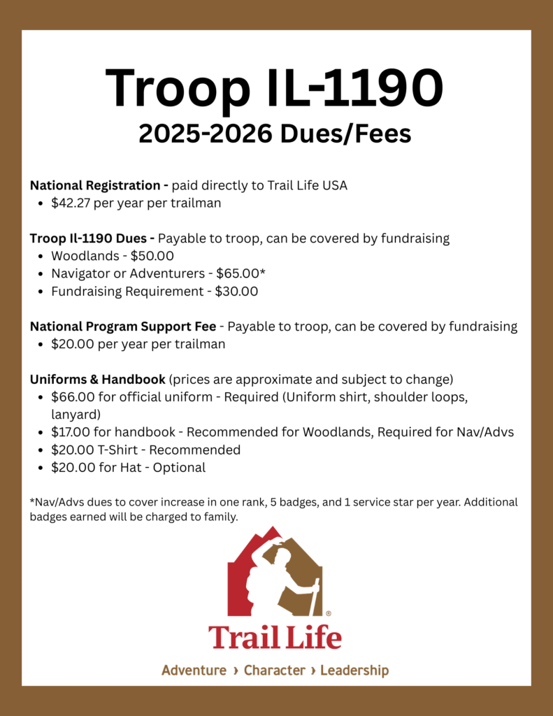 TLUSA has a three tiered fee program. The National Registration is completed online and is paid directly to TLUSA when you complete your registration. The National Program Support Fee is paid by the troop to the national program each fall based on the number of members in the troop. Troop Dues remain at the troop level and cover meeting materials and the cost of most awards. Throughout the year, the troop plans optional activities that trailmen and their families are asked to pay, for example, roller skating, camping registration, or bowling costs. Additionally, our troop requires every trailman to wear a Troop Uniform to every meeting and most events and many boys will need a handbook. Our troop holds a fundraiser each fall. The earnings for this fundraiser are used to offset the National Program Support Fee, usually reducing the portion of the fee that each family is asked to cover.